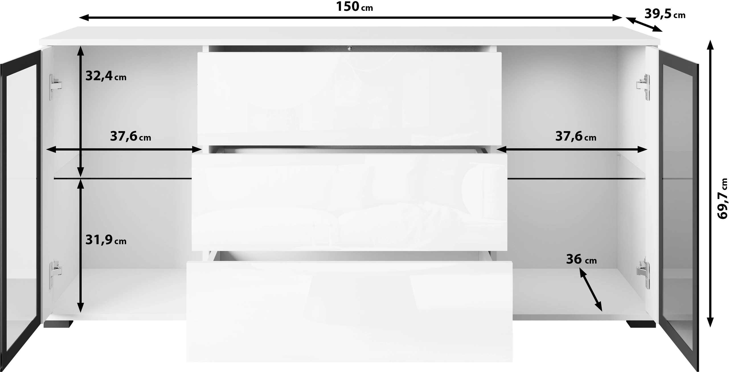 Czarna komoda o szerokości 150 cm to propozycja dla osób, które stawiają na nowoczesny design i elegancki charakter wnętrza. Jednolity, głęboki czarny kolor nadaje meblowi luksusowego wyglądu i sprawia, że staje się on wyrazistym elementem aranżacji salonu, jadalni lub gabinetu.