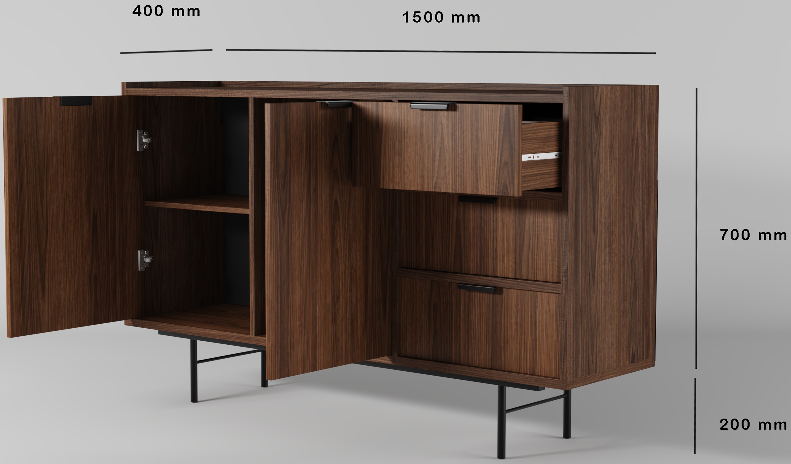 - Wymiary: szerokość 150 cm, głębokość 40 cm, wysokość całkowita 90 cm (korpus 70 cm + nogi 20 cm)