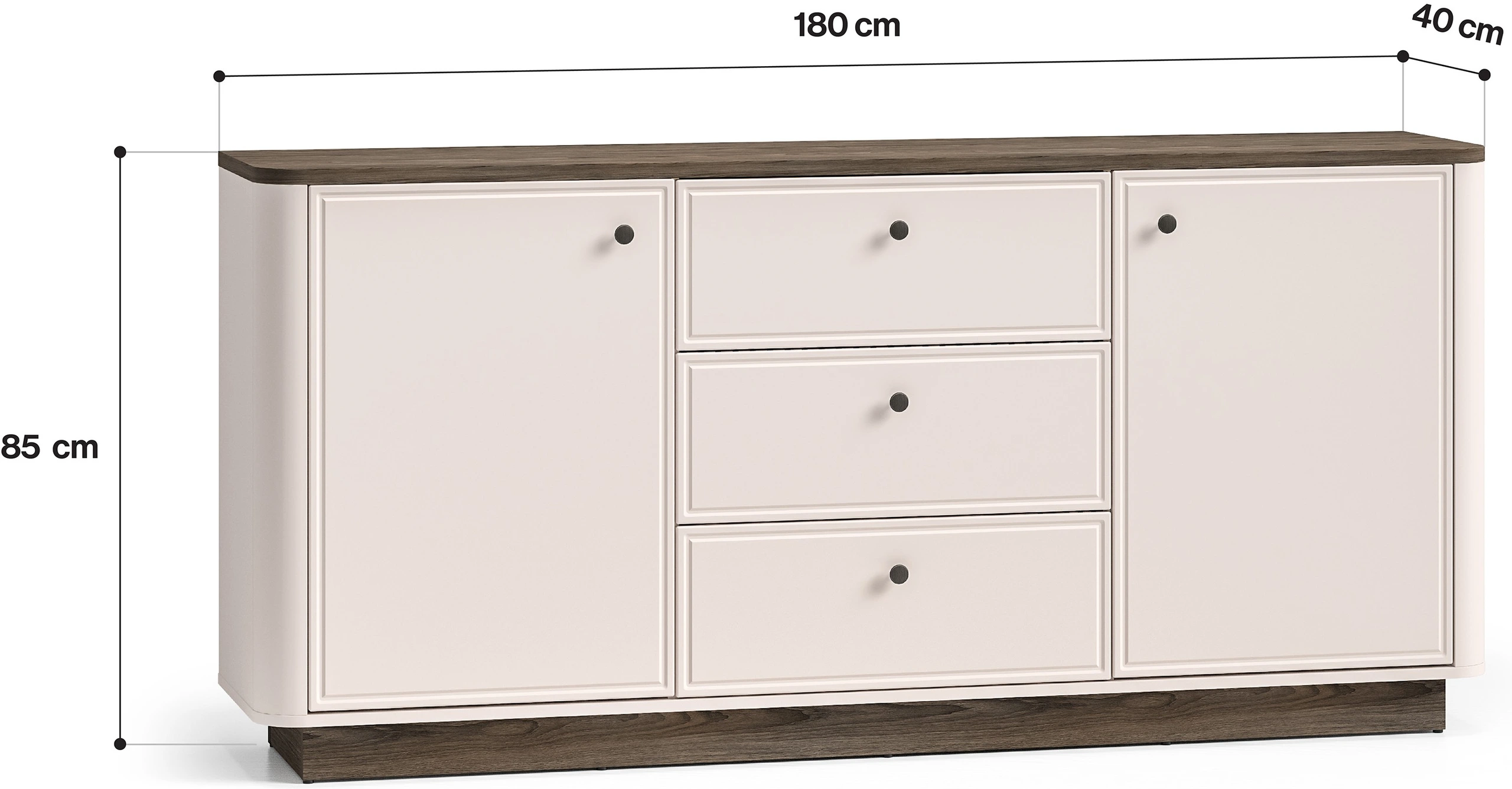 Komoda VILANO została zaprojektowana tak, aby maksymalnie ułatwić organizację przestrzeni. Jej szerokość 180 cm zapewnia dużą pojemność, a jednocześnie harmonijny design sprawia, że mebel doskonale wpisuje się w modne, jasne aranżacje. Blat w kolorze dąb windmill dark stwarza idealne miejsce na dekoracje, książki lub domowe oświetlenie, dodając wnętrzu przytulnego charakteru.