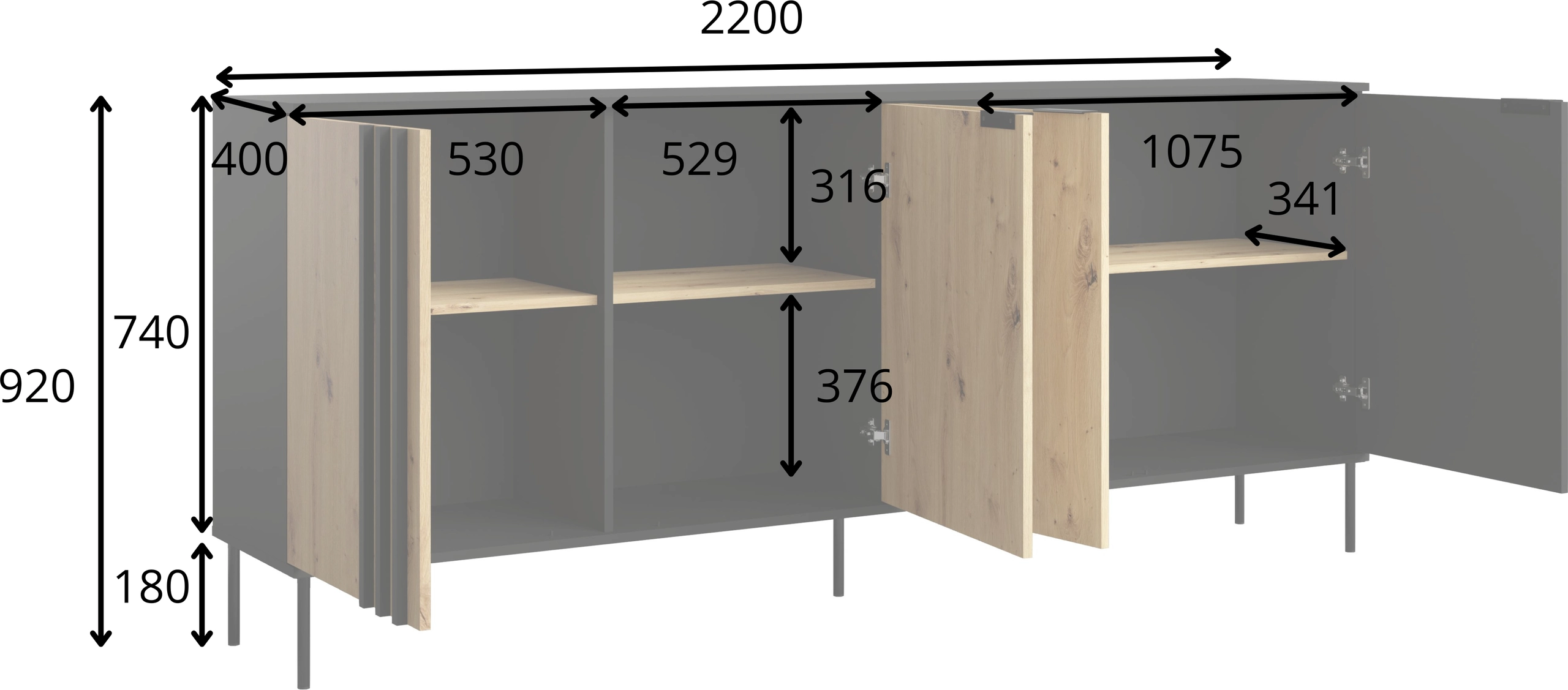 Komoda do salonu RUSTICA to połączenie industrialnej estetyki z funkcjonalnością, której potrzebujesz na co dzień. Czarna kolorystyka przełamana dekorem dąb artisan oraz dekoracyjne lamele na frontach tworzą niebanalny akcent we wnętrzu. Dzięki długości 220 cm i aż czterem drzwiczkom zyskała imponującą pojemność, która pozwoli Ci zapanować nad porządkiem w salonie, jadalni czy gabinecie.