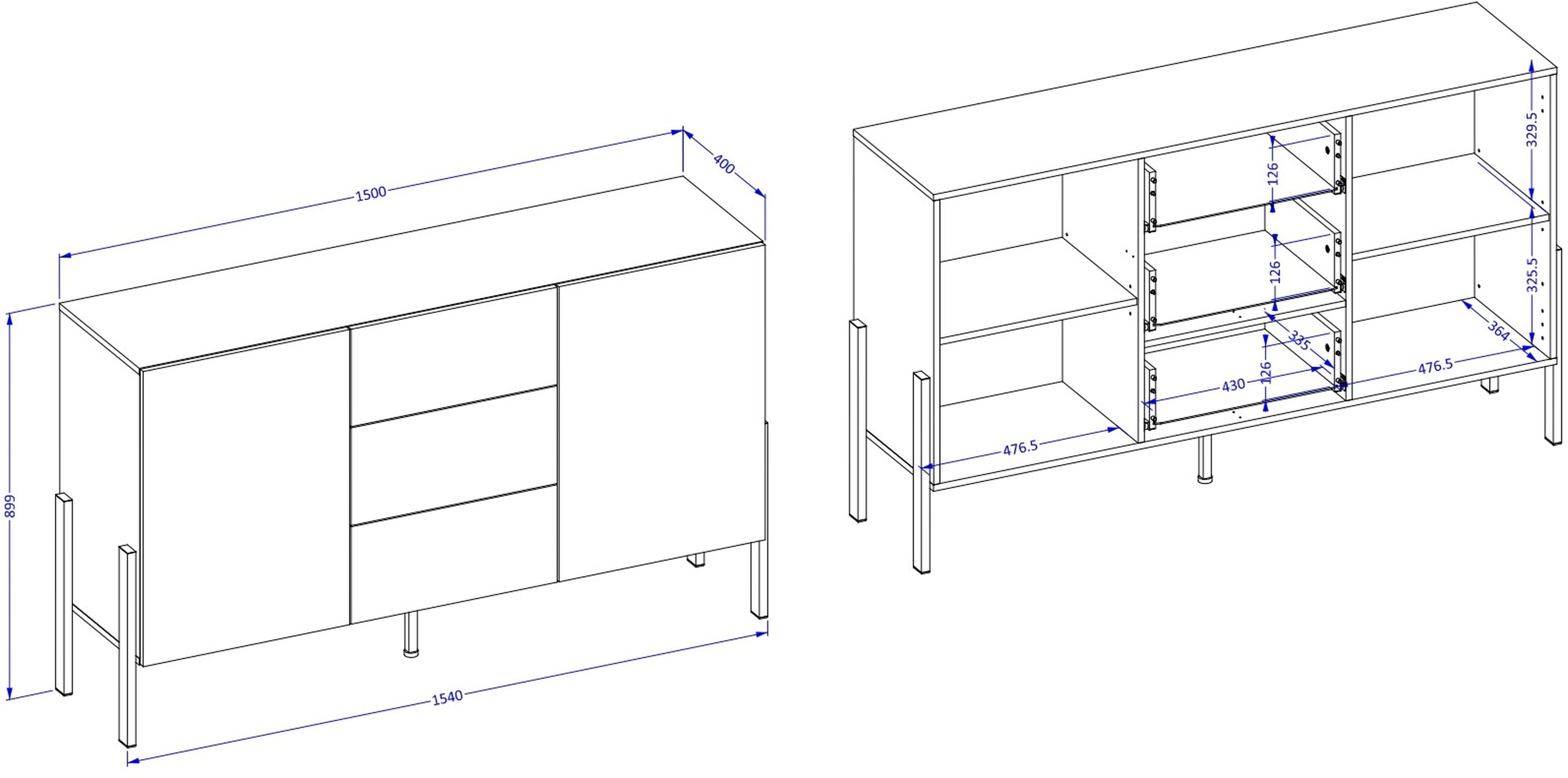 Komoda JUKON oferuje przestrzeń do przechowywania w formie trzech szuflad i dwóch pojemnych szafek z półkami, co pozwala na wygodne uporządkowanie różnych przedmiotów – od książek po dekoracje. Dzięki temu możesz cieszyć się harmonią i porządkiem w swoim salonie każdego dnia.