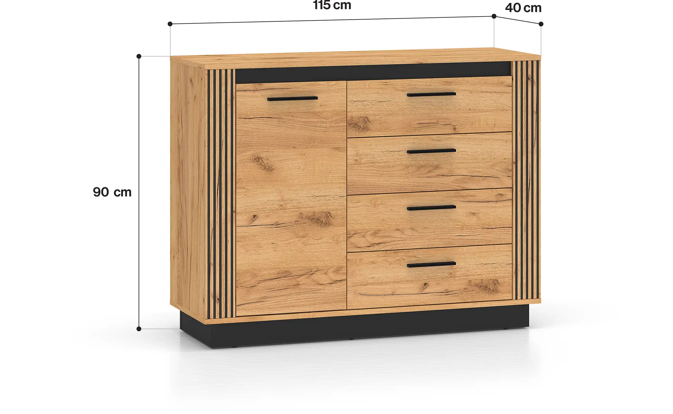 Kompaktowa komoda o szerokości 115 cm to idealne połączenie funkcjonalności i nowoczesnego designu. Jej harmonijna kolorystyka – ciepły dąb craft złoty i głęboka czerń – sprawdzi się zarówno w salonie, sypialni, jak i domowym biurze. Mebel oferuje aż cztery pojemne szuflady oraz jedną szafkę z półką, zapewniając mnóstwo miejsca na ubrania, dokumenty lub inne drobiazgi.