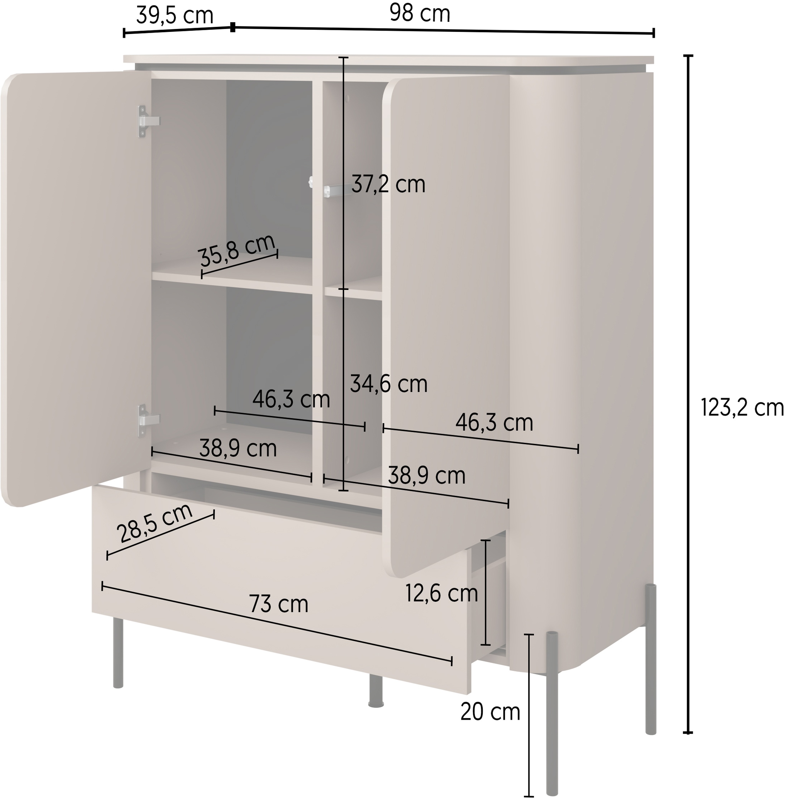 Komoda z kolekcji BELLO to idealne połączenie minimalistycznej stylistyki z praktycznym wnętrzem, które zaskoczy Cię pojemnością. Jej subtelna kolorystyka Congo oraz zaoblony narożnik nadają jej lekkości, a czarne, metalowe nogi dodają charakteru. Dzięki przemyślanemu układowi z półkami i szufladą z systemem PUSH TO OPEN, komoda świetnie sprawdzi się zarówno w salonie, jak i w sypialni czy przedpokoju.