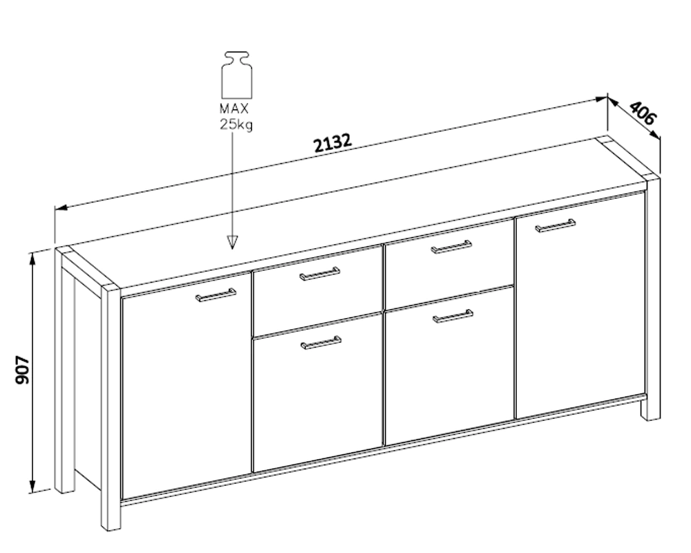 Komoda ANGELINO została wykonana w nowoczesnej stylistyce, dzięki której doskonale odnajduje się we współczesnych aranżacjach salonów. Komodę wyposażono w czworo drzwi, gdzie za każdymi z nich znajduje się półka oraz we dwie szuflady znajdujące się w jej centralnej części u góry, które osadzono na prowadnicach kulkowych z pełnym wysuwem. Dodatkowo uchwyty komody zostały wykonane z metalu w matowym wykończeniu i czarnym kolorze, dzięki czemu są bardzo solidne oraz nadają komodzie industrialnych akcentów stylistycznych.