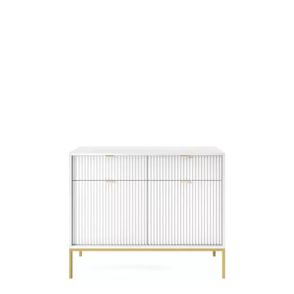 Aby podkreślić luksusowy wygląd komody, obrzeże zostało wykonane z wysokiej jakości tworzywa ABS, które nie tylko zapewnia trwałość, ale także dodaje eleganckiego wykończenia. Nogi komody są złote i metalowe, co dodaje subtelnej nuty blasku i podkreśla glamour stylu. To połączenie złota i metalu przyciąga wzrok i nadaje komodzie unikalnego charakteru.