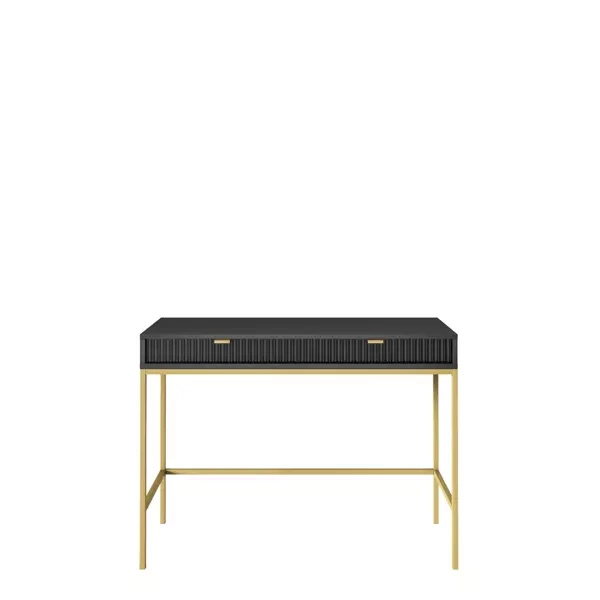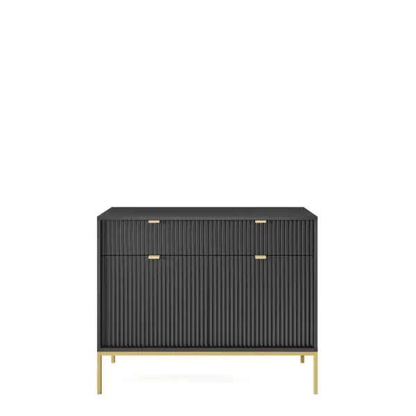 Korpus komody został wykonany z solidnej płyty laminowanej o grubości 16 mm w głębokim, klasycznym kolorze czarnym. Taki wybór koloru podkreśla elegancję mebla i zapewnia harmonijne dopasowanie do różnorodnych wnętrz. Fronty komody są natomiast ryflowane, co dodaje im niepowtarzalnego charakteru.
