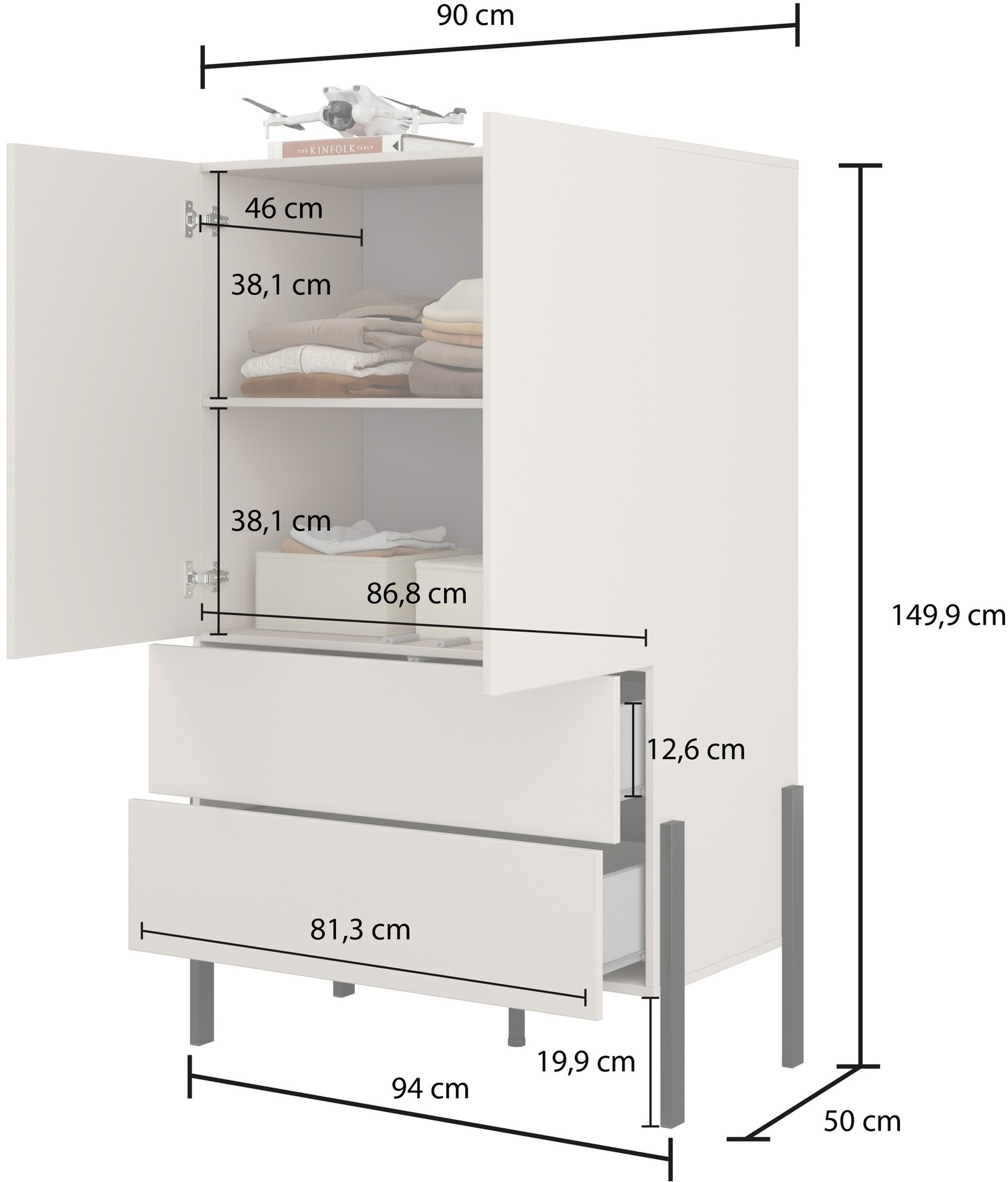 - Wymiary: szerokość 90 cm, wysokość 149,9 cm, głębokość 50 cm