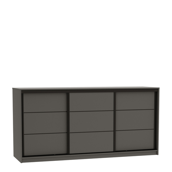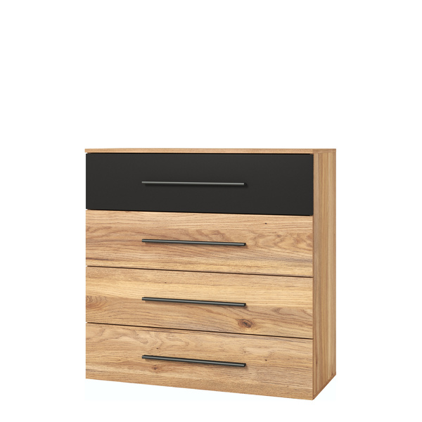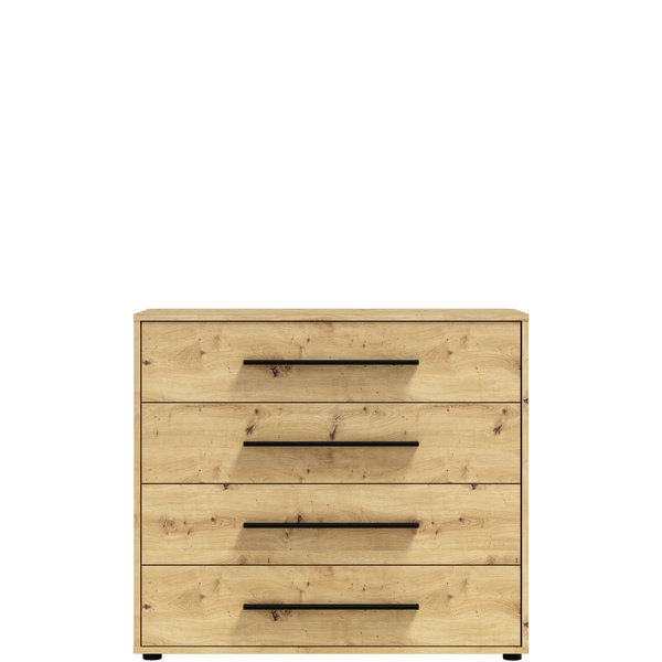 Praktyczna i estetyczna konstrukcja komody jest umiejscowiona na wysokich, wytrzymałych nóżkach, które dodają jej lekkości i nowoczesnego wyglądu. Korpus komody został wykonany z solidnej płyty laminowanej o grubości 16 mm, gwarantującej jej długotrwałą trwałość i odporność na uszkodzenia.