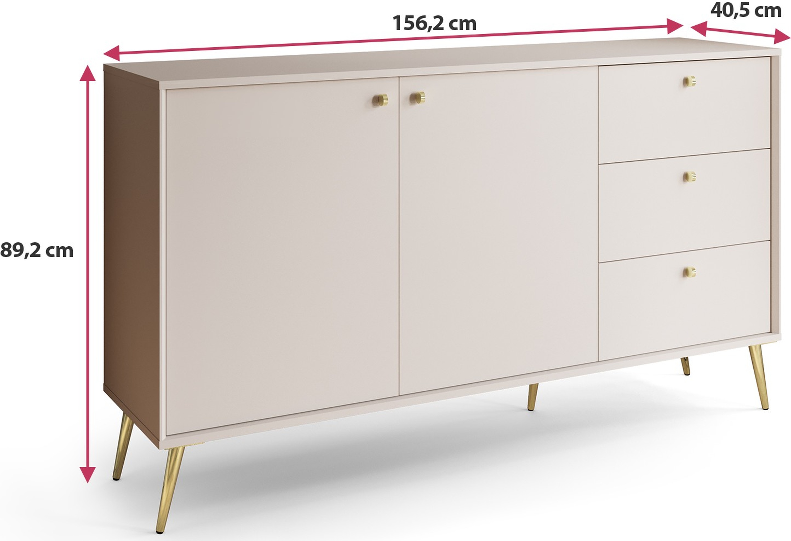Komoda do salonu ROSEA o szerokości 156 cm to idealne połączenie stylowego designu i praktycznych rozwiązań do przechowywania. Jej beż piaskowy kolor wprowadza do wnętrza ciepło i subtelny luksus, a złote detale nadają jej wyjątkowego charakteru. Dzięki pojemnym szufladom i półkom ROSEA świetnie sprawdzi się zarówno w nowoczesnym salonie, jak i klasycznym wnętrzu.