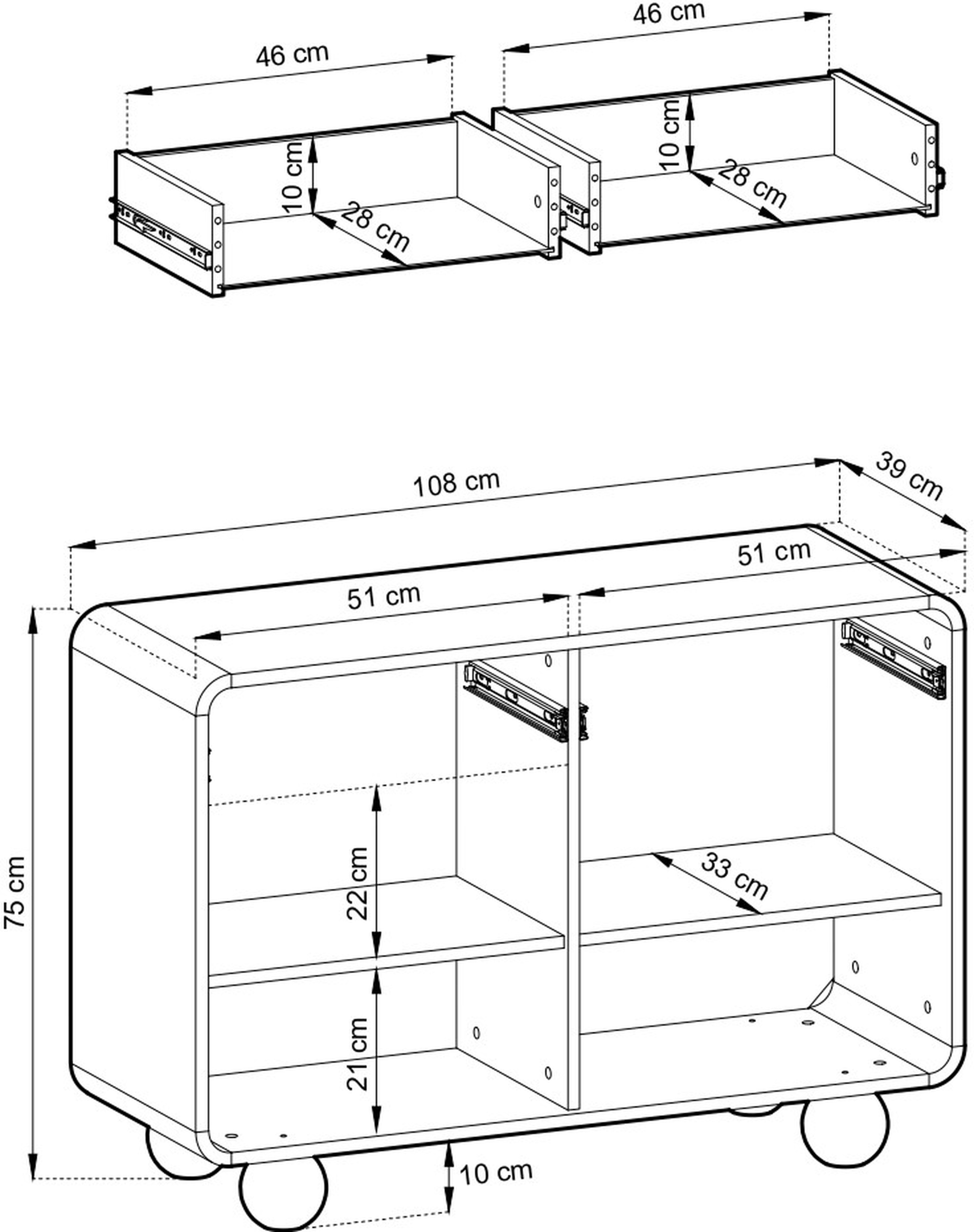 - Praktyczne wnętrze – dwie pojemne szuflady i cztery zamykane komory z półkami pomieszczą wszystkie domowe drobiazgi