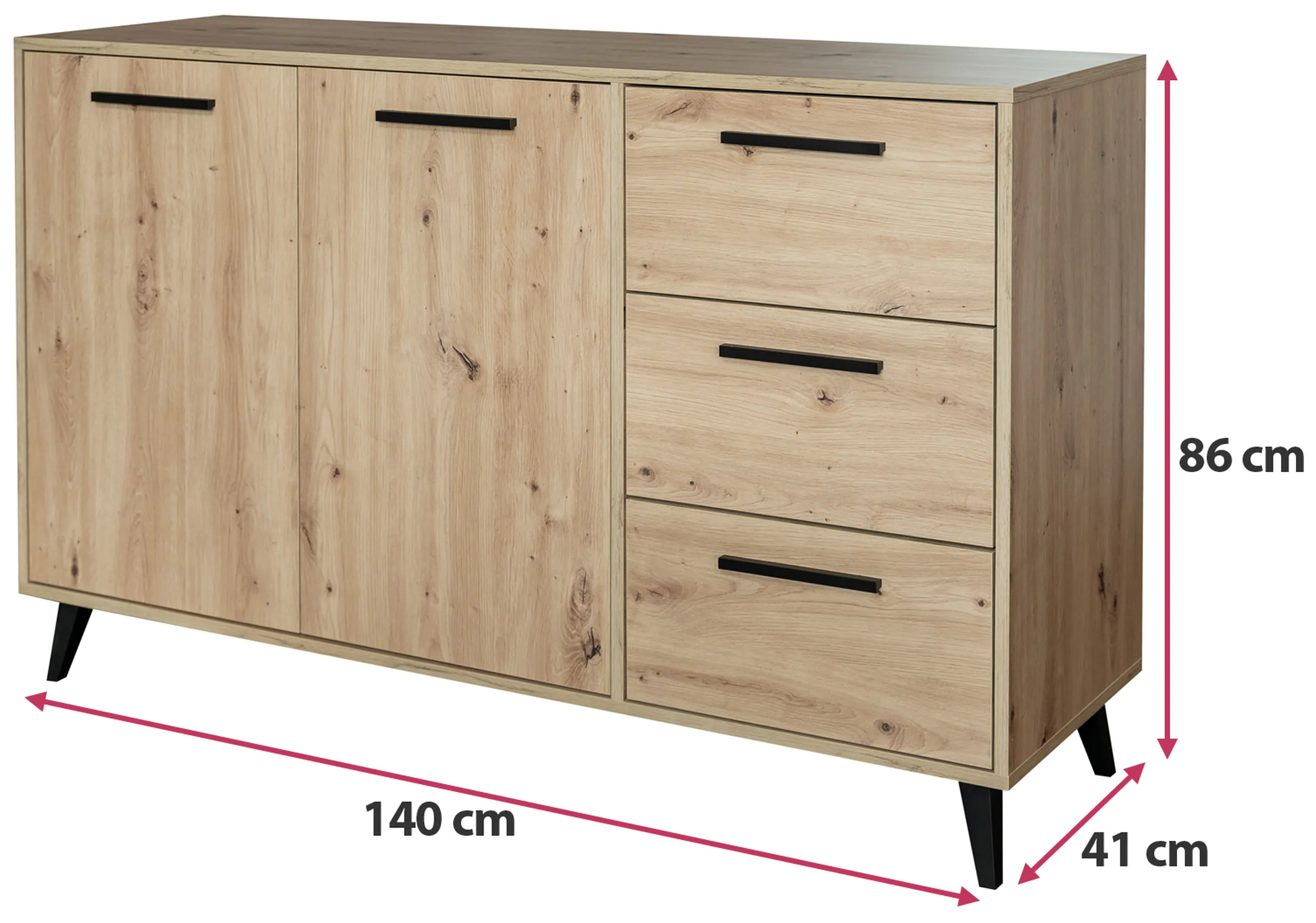 Komoda o szerokości 140 cm KODA to idealne połączenie elegancji i funkcjonalności, które doskonale wpasuje się w każde wnętrze. Zaprojektowana z myślą o praktycznym przechowywaniu, oferuje przemyślany układ półek i szuflad, który ułatwia organizację i porządek w domu.
