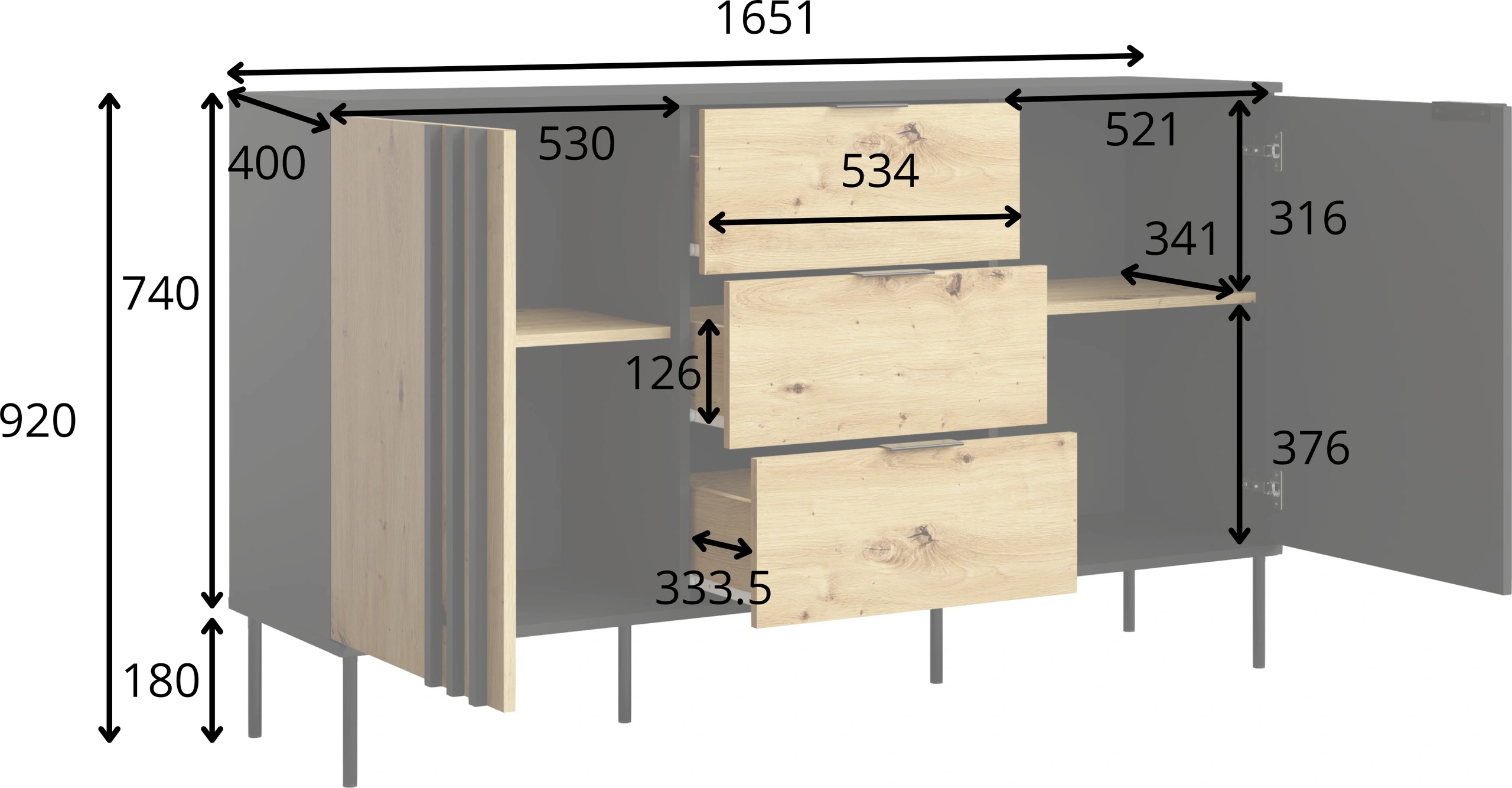- Wymiary: szerokość 165 cm, wysokość 92 cm, głębokość 40 cm