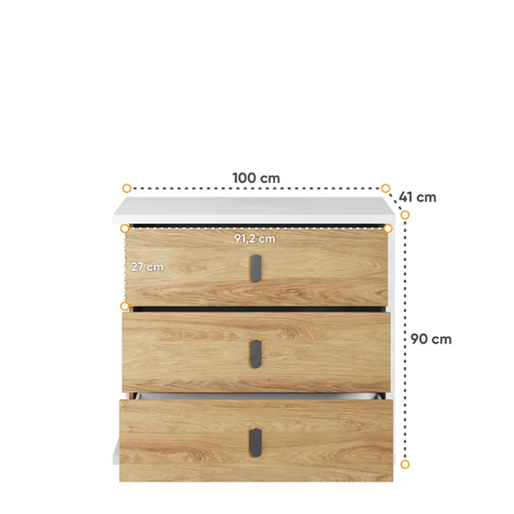 Komoda dziecięca SIMI została wyposażona w trzy pojemne szuflady metalowymi uchwytami osadzone na prowadnicach kulkowych. Komoda do pokoju dziecięcego z szufladami została wykonana w nowoczesnej stylistyce podążając za współczesnymi trendami aranżacji pokoi dziecięcych, połączenie koloru bieli alpejskiej z ciepłym kolorem dębu hikory naturalnej uczyni pomieszczenie przytulnym.