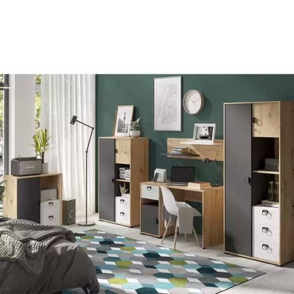 Meble młodzieżowe TOM to świetny przykład nowoczesnego wykończenia, które wpasuje się nawet w najbardziej wymagające gusta. Proste a zarazem funkcjonalne i pojemne rozwiązania do pokoju nastolatków to podstawa zadowolenia rodziców. Na system mebli młodzieżowych TOM składają się elementy takie jak: szafa z uchylnymi drzwiami, szafa narożna, regały z drzwiami uchylnymi, pojemne komody z szufladami i drzwiczkami, łóżko z pojemnikiem i półkami, pojemne biurko z szufladami oraz dwupoziomowa półka wisząca. Takie rozwiązania jak pojemnik na pościel podnoszony na automatach czy rolkowe prowadnice szuflad zapewniają przyjemne i łatwe użytkowanie mebli. Meble w kolorze grafitowym z frontami w industrialnym stylu imitującym beton architektoniczny.