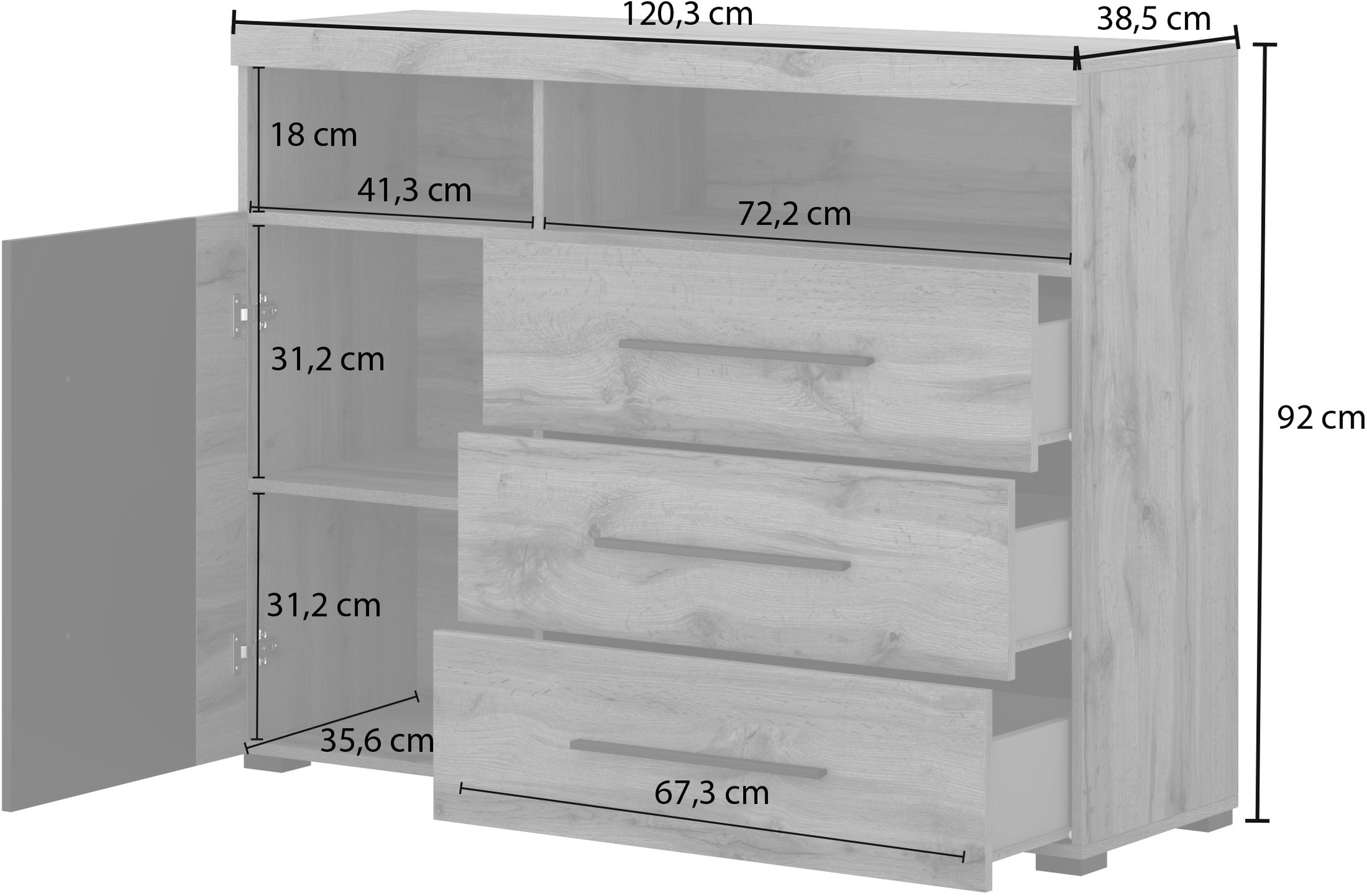 ROGER to komoda z szufladami i szafką, która idealnie wpasuje się do salonu, sypialni, a nawet do przedpokoju. Dzięki przemyślanej konstrukcji łatwo utrzymasz porządek i zorganizujesz przestrzeń – zarówno w części otwartej, jak i zamkniętej.