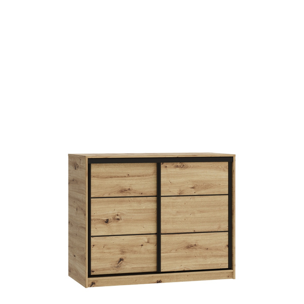Komoda z szufladami LOFT to połączenie nowoczesnego designu i funkcjonalności. Komoda przesuwna o szerokości 120 cm wyróżnia się dwudrzwiową konstrukcją opartą na metalowym systemie przesuwnym w czarnym kolorze. To rozwiązanie nie tylko podkreśla industrialny charakter mebla, ale także pozwala na wygodne korzystanie z przestrzeni wewnątrz