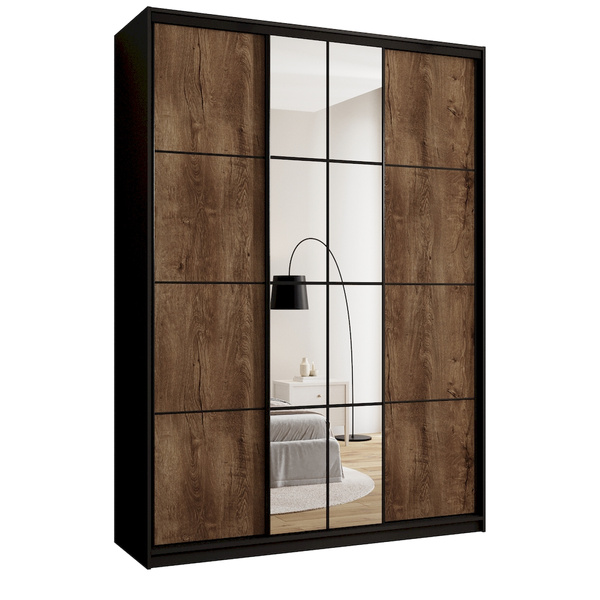 Na centralnych drzwiach szafy znajduje się lustro, które doskonale łączy estetykę z funkcjonalnością. Lustro nie tylko powiększa optycznie wnętrze, ale również pozwala wygodnie przejrzeć się podczas codziennego przygotowywania stylizacji. Dzięki temu szafa doskonale sprawdzi się w sypialni, garderobie czy przestronnym przedpokoju.
