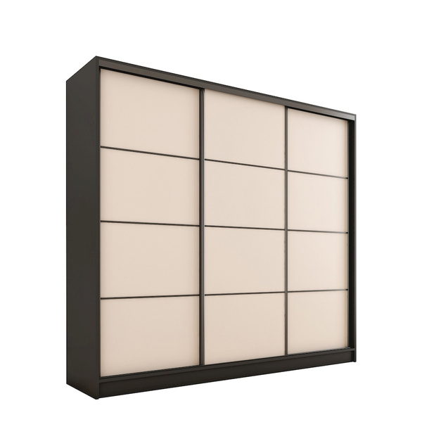 - Stalowe uchwyty w czarnym kolorze zostały umieszczone na krawędziach drzwi. Zostały wykonane w kolorze prowadnicy, dzięki czemu doskonale komponują się z całością szafy.