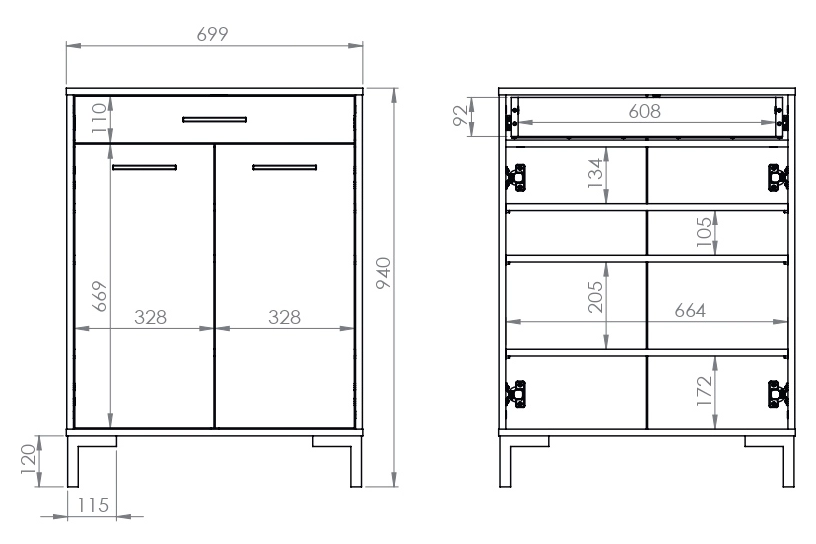 - Korpus oraz front wykonano z płyty laminowanej 16 mm. Płyta laminowana charakteryzuje się odpornością na drobne zarysowania.