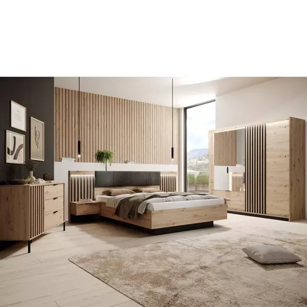 Łóżko z pojemnikiem na pościel UMIO od to harmonijne połączenie nowoczesnej estetyki, funkcjonalności i wygody. Model ten został wyposażony w elastyczny stelaż typu flex, który zapewnia lepsze dopasowanie do ciała i zwiększa komfort snu. Elegancka forma z dębu craft złotego i czarnego weluru dopełnia całość, tworząc wyjątkowy mebel do stylowej sypialni.
