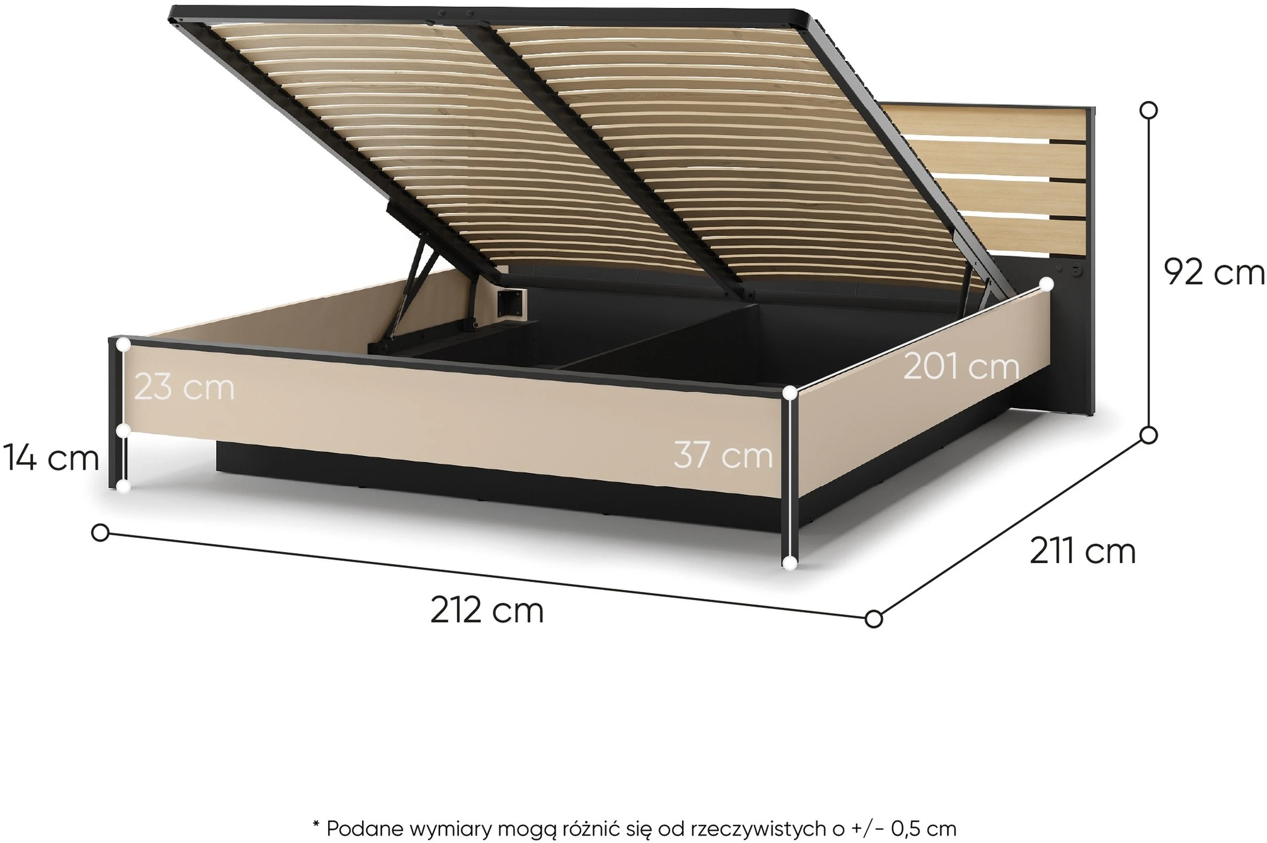 - Stelaż: metalowy, podnoszony, o wymiarach 180x200 cm