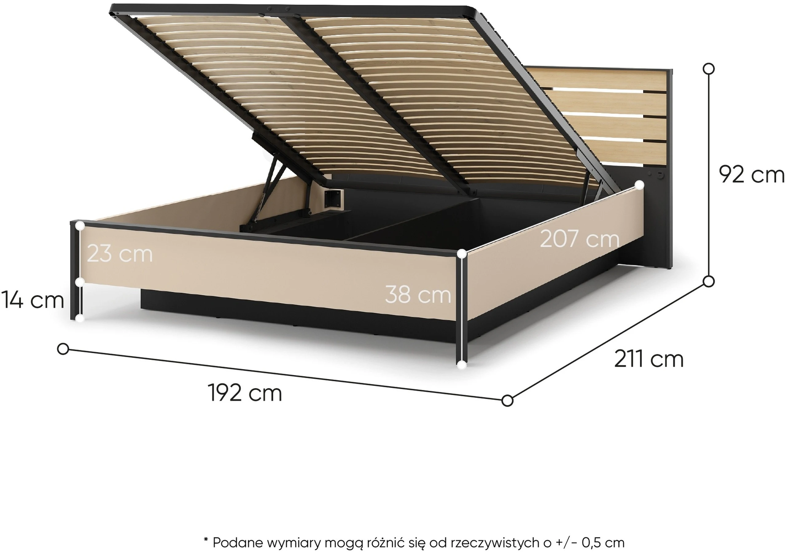 - Stelaż: metalowy, podnoszony, o wymiarach 160x200 cm