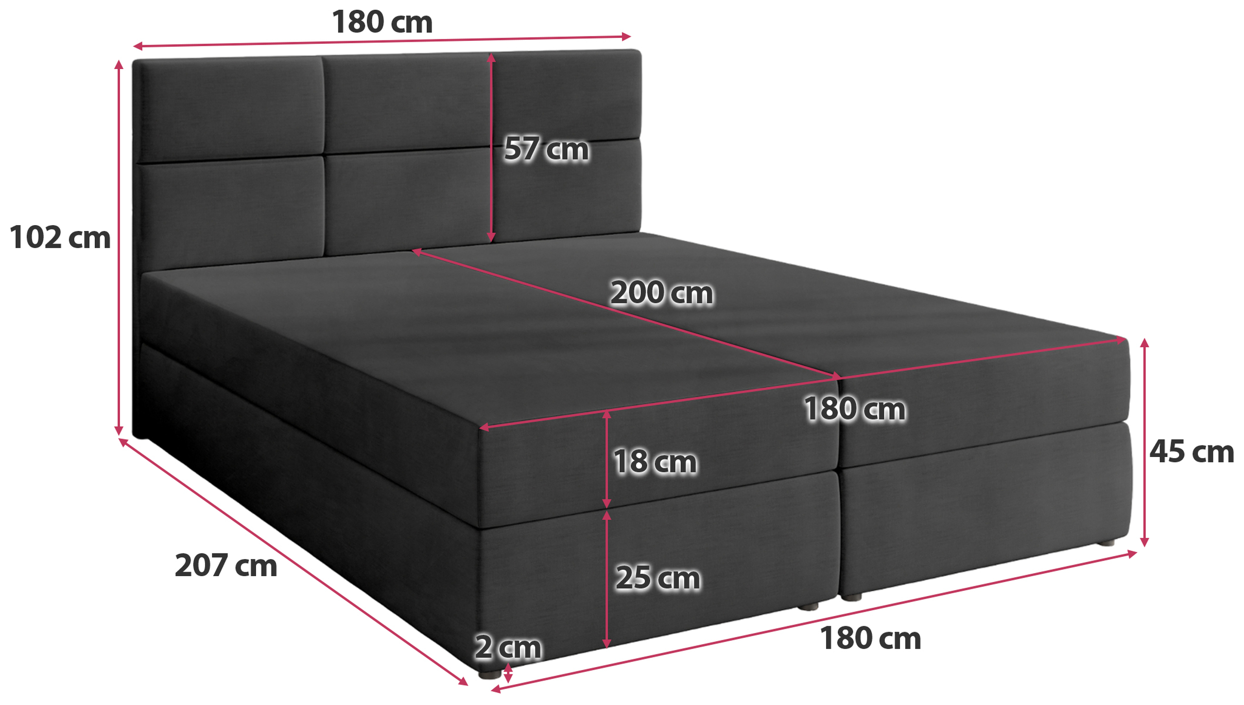 Łóżko kontynentalne 180x200 cm BOSTON to idealne połączenie nowoczesności i komfortu dla osób, które cenią sobie wygodę oraz solidne i estetyczne wykonanie. Nowoczesne łóżko kontynentalne posiada zagłówek z ozdobnymi przeszyciami tworzącymi sześć prostokątów.