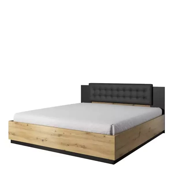 Łóżko sypialniane NELGARI to propozycja wykonana w ponadczasowej, oraz przyciągającej uwagę kolorystyce. Korpus łóżka został wykonany w kolorze dąb artisan, natomiast front i dodatki w kolorze czarnym. Łóżko posiada zagłówek oraz miejsce na materac i stelaż o powierzchni 160x200 cm, która gwarantuje komfortową ilość miejsca dla dwóch osób.