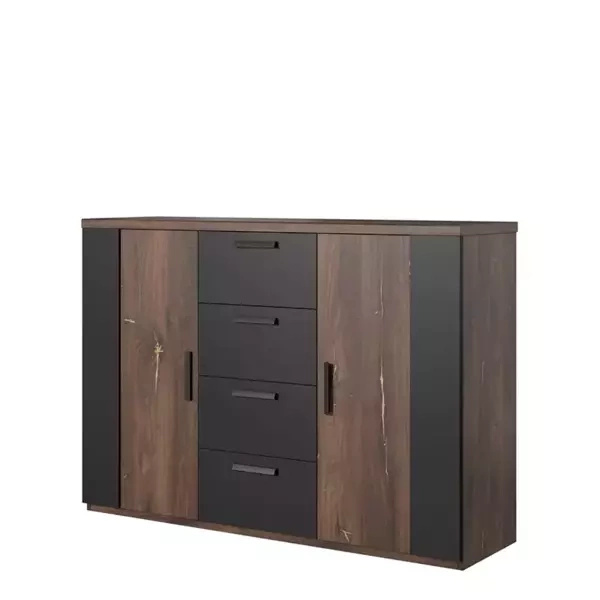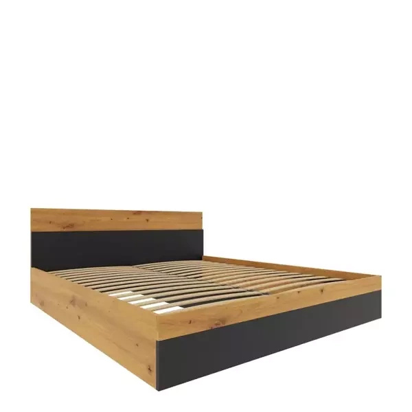 Łóżko sypialniane NELGARI to propozycja wykonana w ponadczasowej, oraz przyciągającej uwagę kolorystyce. Korpus łóżka został wykonany w kolorze dąb artisan, natomiast front i dodatki w kolorze czarnym. Łóżko posiada zagłówek oraz miejsce na materac i stelaż o powierzchni 180x200 cm, która gwarantuje komfortową ilość miejsca dla dwóch osób.
