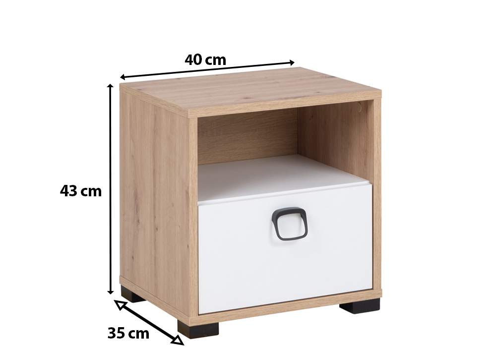 Mała szafka nocna CAMERUN łączy w sobie funkcjonalność i nowoczesny design, idealna do pokoju młodzieżowego. Ta szafka nocna z szufladą to doskonałe rozwiązanie, by utrzymać porządek w przestrzeni młodego użytkownika. Szuflada szafki nocnej osadzona jest na prowadnicach kulkowych, co gwarantuje płynne wysuwanie i dużą nośność, a jednocześnie pozwala na łatwe przechowywanie drobiazgów, takich jak książki czy akcesoria elektroniczne. Obrzeża szafki nocnej są zabezpieczone wytrzymałą okleiną ABS, co sprawia, że mebel jest odporny na uszkodzenia, a jego żywotność zostanie zachowana przez długie lata użytkowania. Nowoczesna stylistyka tej szafki nocnej do pokoju młodzieżowego sprawi, że będzie się idealnie komponować z różnymi aranżacjami wnętrz, dodając im wyjątkowego charakteru. Niezależnie od tego, czy jest to miejsce do nauki, relaksu czy zabawy, młodzieżowa szafka nocna stanowi doskonałe uzupełnienie każdego pokoju.