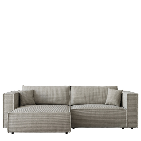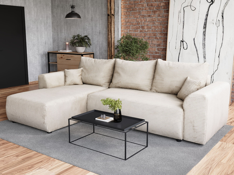 • Uniwersalna konstrukcja umożliwia montaż narożnika zarówno w wersji lewo-, jak i prawostronnej. Stronę, na której umieszczona jest otomana, można wybrać podczas składania mebla, co daje elastyczność dopasowania do pomieszczenia.