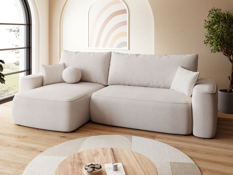 Rozkładany narożnik boucle wyposażony jest w dwie duże, profilowane poduszki, które zapewniają wygodne oparcie i stylowy wygląd. Jego tył obity jest tą samą tkaniną, co reszta mebla, co daje możliwość ustawienia narożnika w dowolnym miejscu w salonie – nawet na środku pokoju.