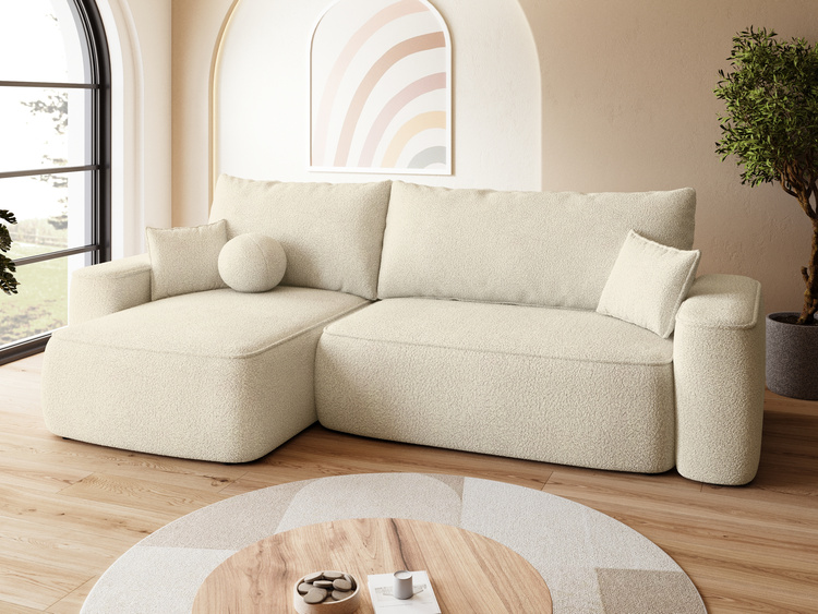 Nowoczesny narożnik boucle NORBERT – komfortowy i funkcjonalny mebel z funkcją spania