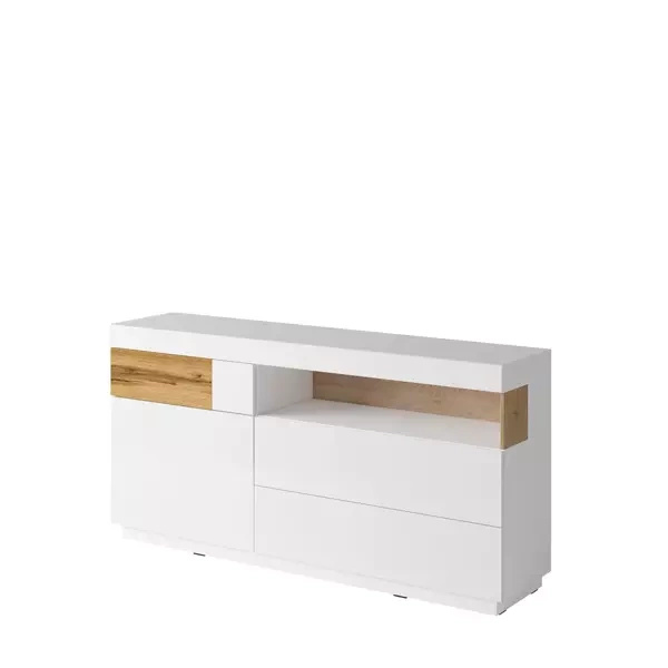 Obok niej znajduje się komoda, której główną zaletą jest szuflada na prowadnicach rolkowych. Ten element gwarantuje płynne otwieranie i zamykanie, co w połączeniu z nowoczesnym wyglądem czyni ją nie tylko praktyczną, ale i atrakcyjną.