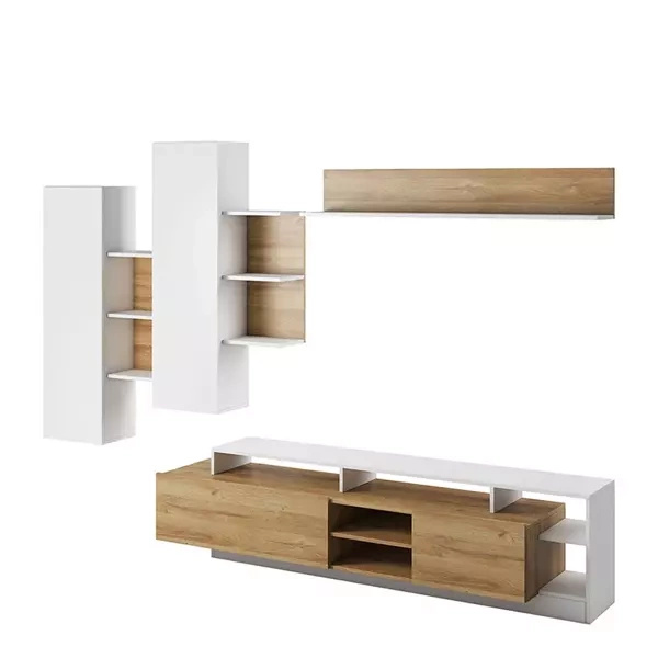 Odkryj unikalny styl i funkcjonalność z naszą nowoczesną meblościanką. Składa się ona z wyjątkowo eleganckiej komody z trzema półkami i szufladą na prowadnicach rolkowych oraz dwóch imponujących witryn ze szklanymi półkami. Ta wyrafinowana kombinacja mebli przemieni Twoje wnętrza, nadając im nowoczesnego, wysublimowanego wyrazu.