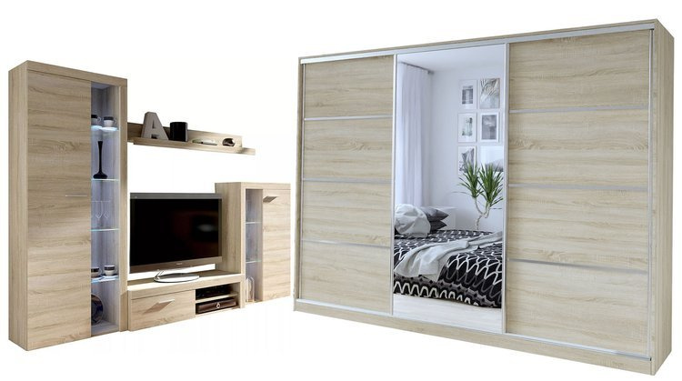 Meble do salonu SAMBA są wykonywane z najwyższej jakości materiałów, charakteryzujących się dużą odpornością na uszkodzenia mechaniczne. Zestaw utrzymany jest w nowoczesnej stylistyce i z pewnością przypadnie do gustu miłośnikom funkcjonalnej i prostej formy. Zestaw składa się z dwóch pojemnych witryn, które w środku mają 3 półki z płyty. Dwudrzwiowej szafki RTV z półeczką pośrodku oraz półki wiszącej, która pozwoli na zgromadzenie i zaprezentowanie kolekcji książek, zdjęć lub rodzinnych pamiątek. Do meblościanki dołączamy w zestawie szafę przesuwną z lustrem TOP o szerokości 180 cm.