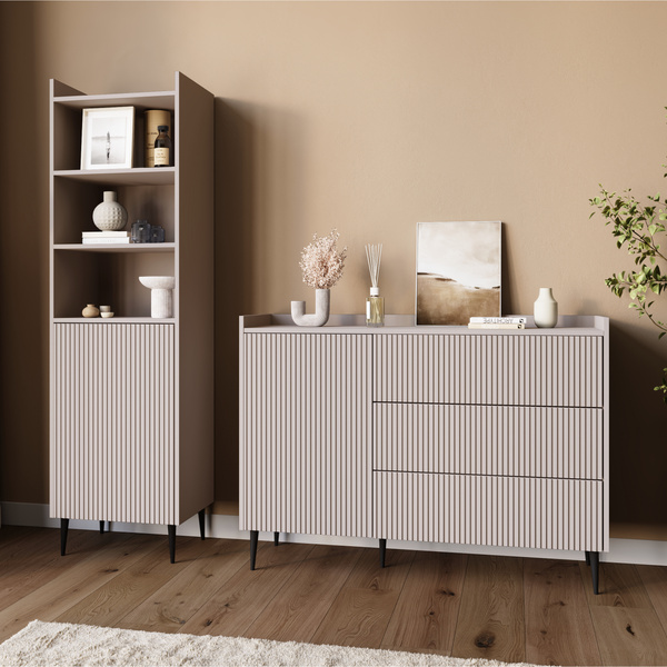 Zestaw mebli do salonu ASPERO to przemyślana kompozycja, która łączy nowoczesny design z praktycznymi rozwiązaniami. Składający się z wysokiego regału i pojemnej komody, zestaw w ciepłym odcieniu orzecha wprowadza do wnętrza przytulność, porządek i nutę wyrafinowania. Ryflowane fronty nadają meblom unikalny charakter, a czarne metalowe nóżki podkreślają ich lekkość i nowoczesność.