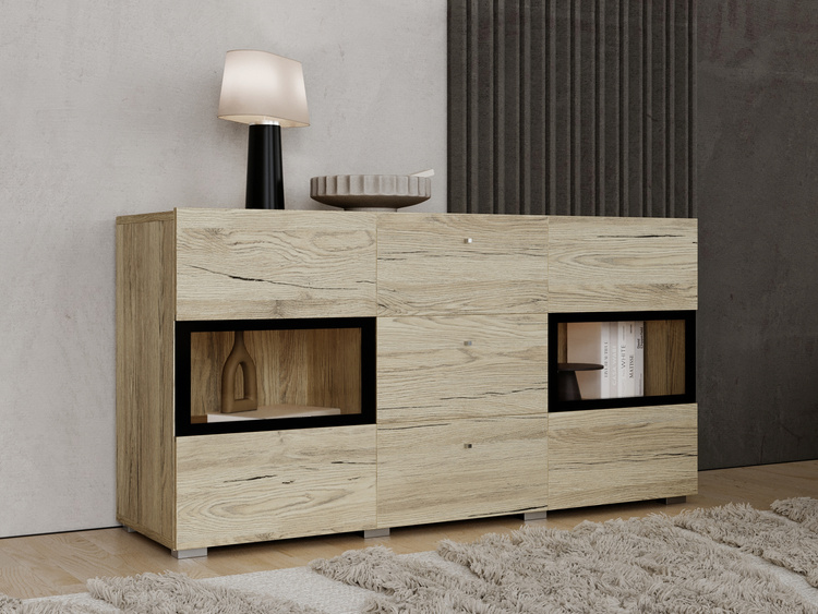 Dwie obszerne witryny to prawdziwe mistrzynie przestrzeni. Ich duże wymiary i liczba półek oferują nieograniczone możliwości organizacji przestrzeni, a szklane półki dodają im subtelności i lekkości. Szafka RTV z otwartą półką oraz dodatkowa półka są idealnym miejscem na Twoje multimedia, sprzęt audio-wideo, a nawet ozdobne przedmioty. Dodatkowym urozmaiceniem jest możliwość podświetlenia szklanych półek, co doda Twoim wnętrzom ciepłego, przytulnego klimatu.