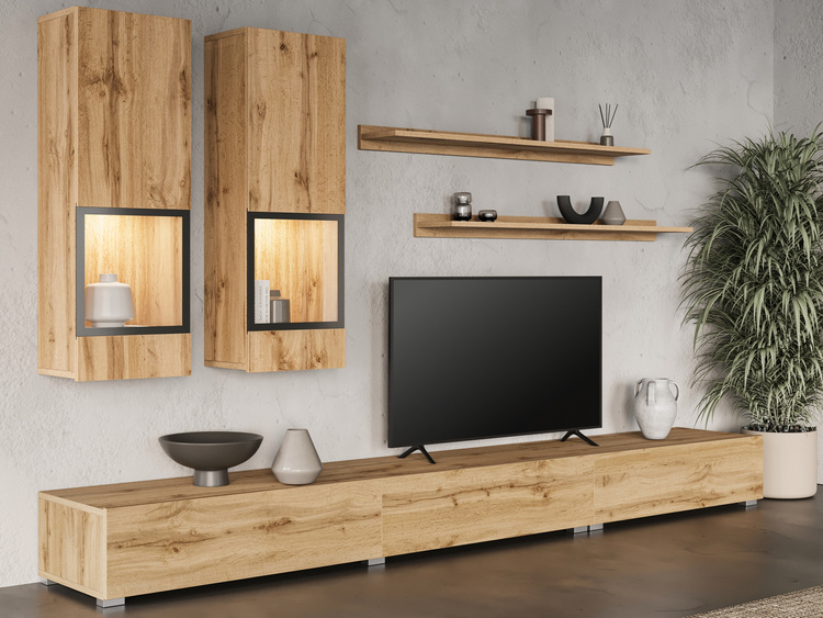 Zanurz się w świecie współczesnej elegancji z naszą wyjątkową meblościanką. Składa się ona z dwóch przestronnych witryn, szafki RTV z otwartą półką oraz dodatkowej, niezależnej półki. Każdy z tych elementów łączy w sobie nowoczesny design i niezrównaną funkcjonalność, tworząc harmonijną całość, która doskonale wpisuje się w każde wnętrze.