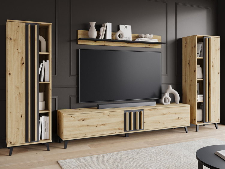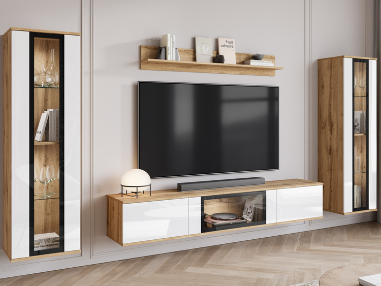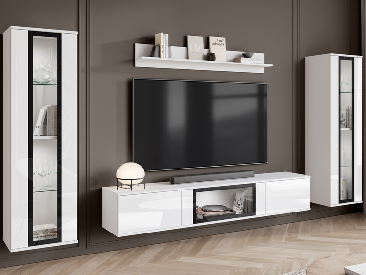 Meble do salonu SAMBA są wykonywane z najwyższej jakości materiałów, charakteryzujących się dużą odpornością na uszkodzenia mechaniczne. Zestaw utrzymany jest w nowoczesnej stylistyce i z pewnością przypadnie do gustu miłośnikom funkcjonalnej i prostej formy. Zestaw składa się z dwóch pojemnych witryn, które w środku mają 3 półki z płyty. Dwudrzwiowej szafki RTV z półeczką pośrodku oraz półki wiszącej, która pozwoli na zgromadzenie i zaprezentowanie kolekcji książek, zdjęć lub rodzinnych pamiątek. Do meblościanki dołączamy w zestawie nowoczesną komodę z szufladami.