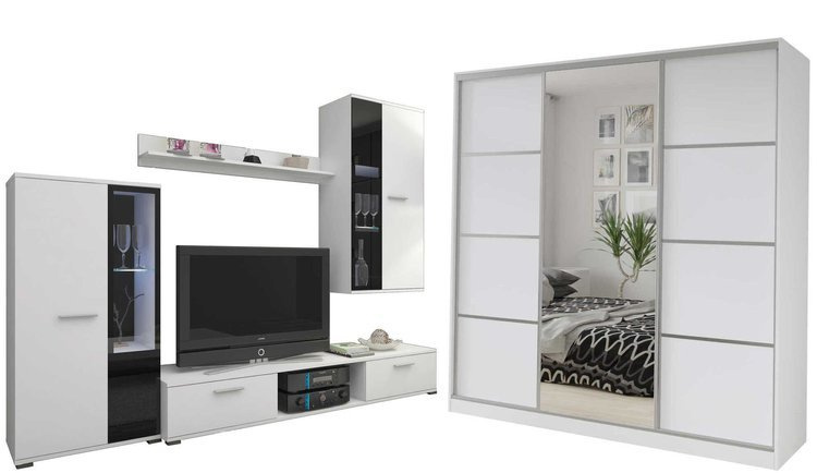 Meble do salonu SAMBA BIG są wykonywane z najwyższej jakości materiałów, charakteryzujących się dużą odpornością na uszkodzenia mechaniczne. Zestaw utrzymany jest w nowoczesnej stylistyce i z pewnością przypadnie do gustu miłośnikom funkcjonalnej i prostej formy. Zestaw składa się z dwóch pojemnych witryn, które w środku mają 3 półki z płyty. Dwudrzwiowej szafki RTV z półeczką pośrodku oraz półki wiszącej, która pozwoli na zgromadzenie i zaprezentowanie kolekcji książek, zdjęć lub rodzinnych pamiątek. Do meblościanki dołączamy w zestawie komodę z dwoma szufladami i dwoma zamykanymi szafkami.