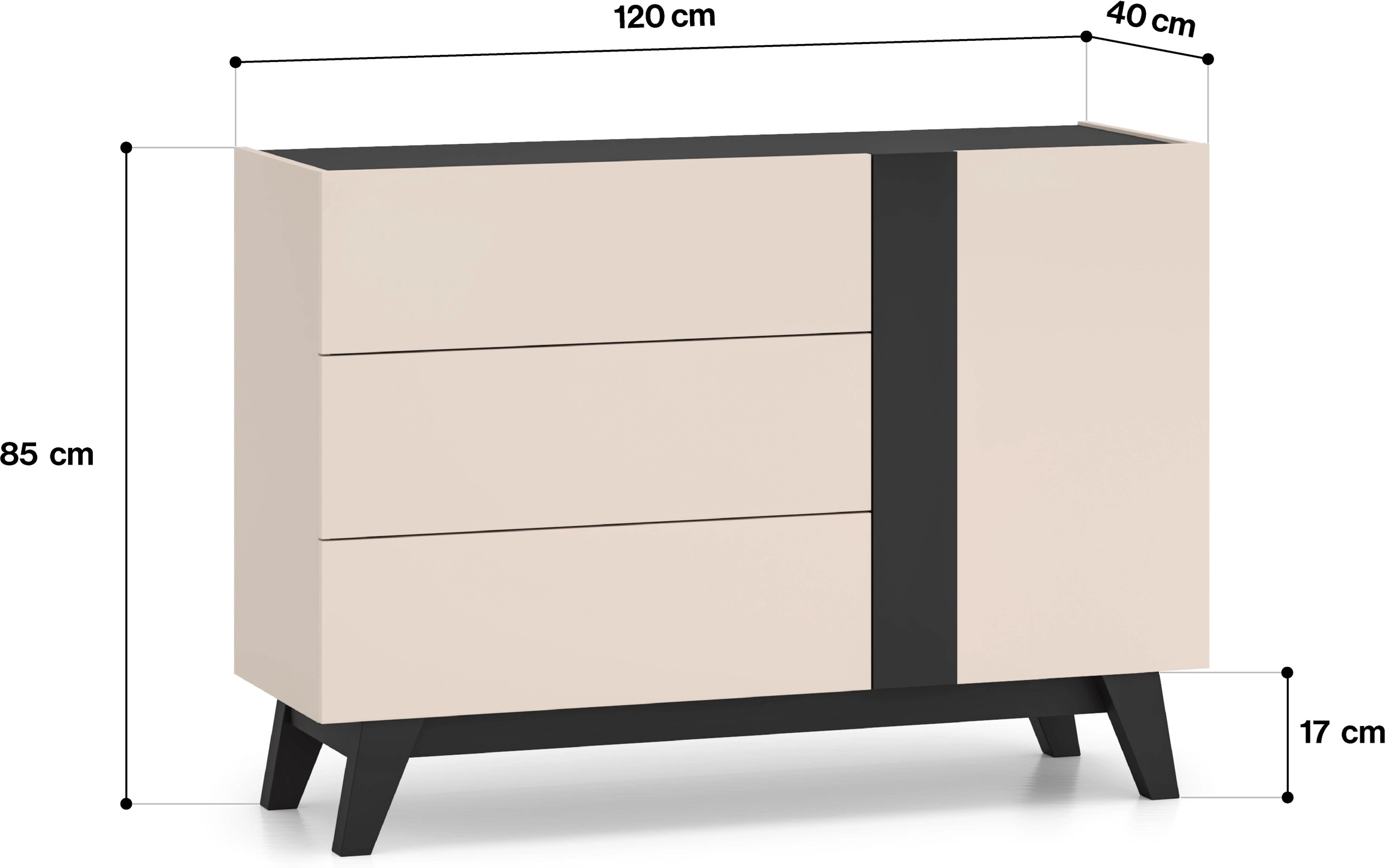 FERIO to komoda, która doskonale sprawdzi się w salonie, jadalni, a nawet w sypialni. Jej nowoczesna forma podkreślona eleganckim połączeniem kolorów sprawia, że pasuje zarówno do wnętrz minimalistycznych, jak i bardziej klasycznych. Przemyślany układ wnętrza ułatwia przechowywanie niezbędnych rzeczy, a szeroki blat to idealna przestrzeń na dekoracje, ramki ze zdjęciami czy kolekcję książek.