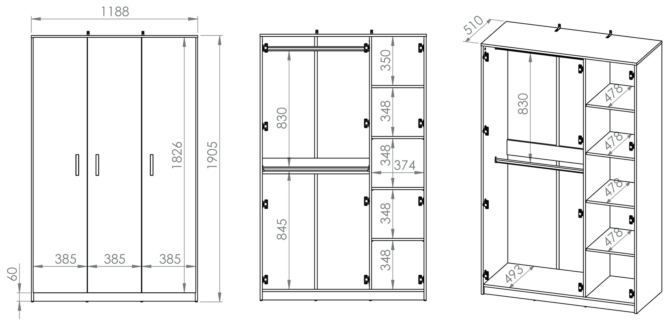 Młodzieżowa szafa trzydrzwiowa z drążkami i półkami 120 cm FINI