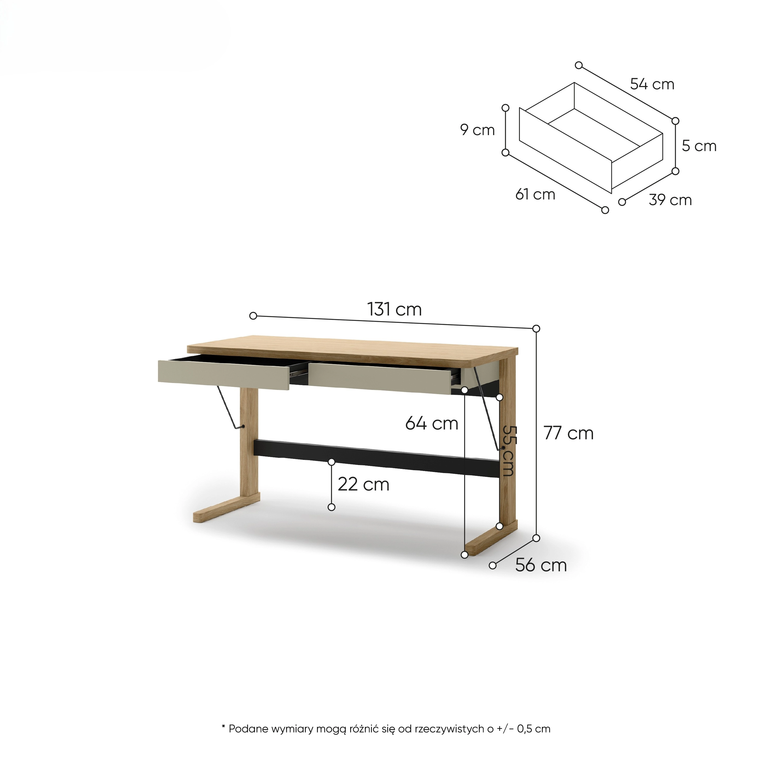 - Ergonomiczna wielkość blatu – szerokość 131 cm zapewnia komfort pracy i nauki