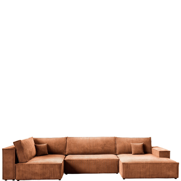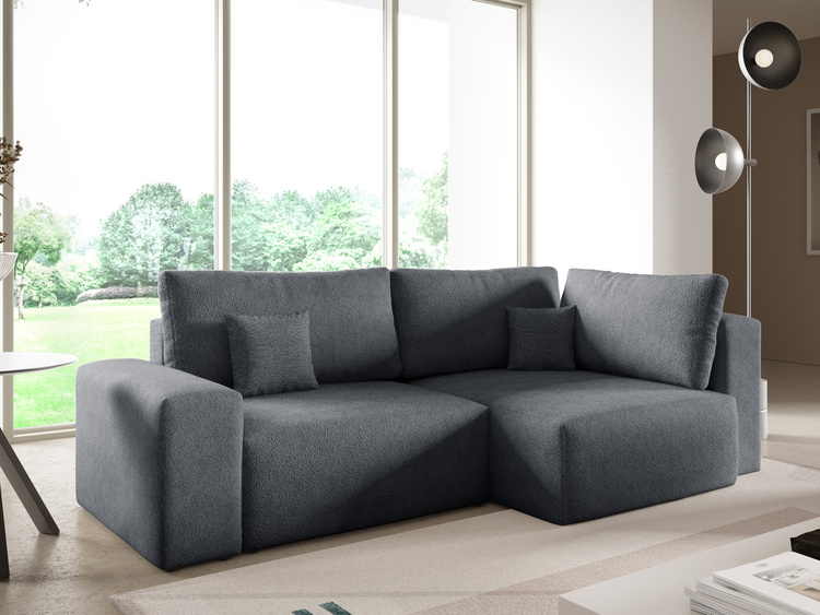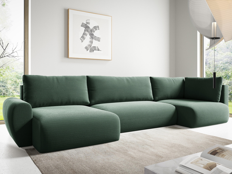Rozkładany narożnik w kształcie U jest obity przyjemną w dotyku tkaniną typu baranek CENTAUR, która dodaje mu elegancji i współgra z różnymi aranżacjami wnętrz. Duży narożnik w kształcie U jest także bardzo praktyczny – wyposażono go w pojemnik na pościel, który pozwala na przechowywanie niezbędnych akcesoriów i tekstyliów do popołudniowych drzemek i okazjonalnych noclegów. Narożnik w kształcie U dzięki tyłowi obitemu tą samą tkaniną, co reszta mebla jest wolnostojący, pozwala to na swobodne ustawienie go w każdym miejscu salonu.