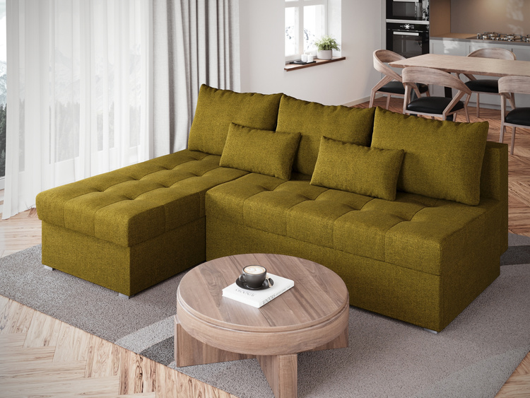 - Kanapa narożna wyposażona w niezwykle praktyczny pojemnik na pościel, który w tym modelu umieszczono pod wysuniętą leżanką.