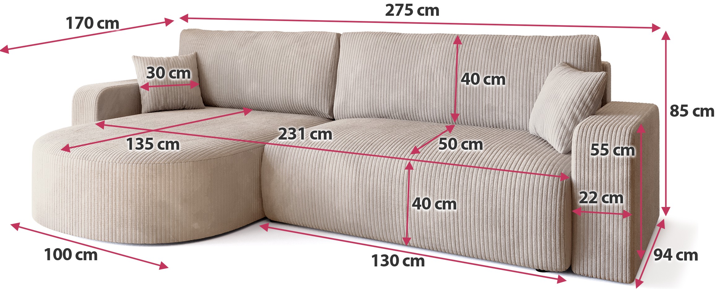 Zaprojektowany z myślą o codziennym komforcie i nowoczesnym stylu, ten narożnik stanie się sercem Twojego salonu. Miękkie, grube poduchy, wygodne siedzisko oraz praktyczna funkcja spania sprawiają, że to idealny wybór dla osób ceniących funkcjonalność i przytulną atmosferę. Obicie z modnej sztruksowej tkaniny dodaje mu charakteru i wyjątkowego uroku.