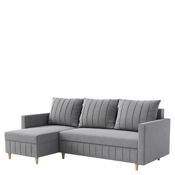 Dzięki mechanizmowi rozkładania DL narożnik z łatwością przekształca się w przestronne łóżko o wymiarach 130x245 cm, oferując wygodne miejsce do spania dla gości. Wbudowany pojemnik na pościel pod siedziskiem pozwala na szybkie i dyskretne przechowywanie kołder i poduszek, utrzymując porządek w salonie.