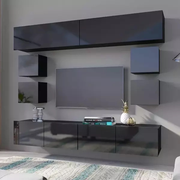 Meblościanka do salonu to komplet, który łączy w sobie estetykę i funkcjonalność. Przestronna trzydrzwiowa komoda, pojemna wysoka komoda oraz elegancka szafka RTV zapewniają mnóstwo miejsca na przechowywanie, a ich design wzbogaca wnętrze o nowoczesny i elegancki styl. To rozwiązanie dla tych, którzy szukają mebli, które będą ozdobą salonu i jednocześnie spełnią wymagania użytkowe.