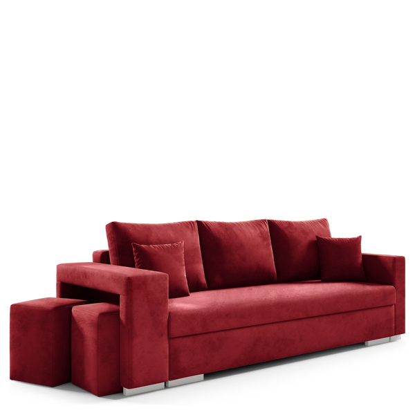 - Konstrukcja sofy składa się z płyty wiórowej, płyty MDF oraz drewna sosnowego. Takie połączenie to gwarancja solidności i trwałości na długi czas.